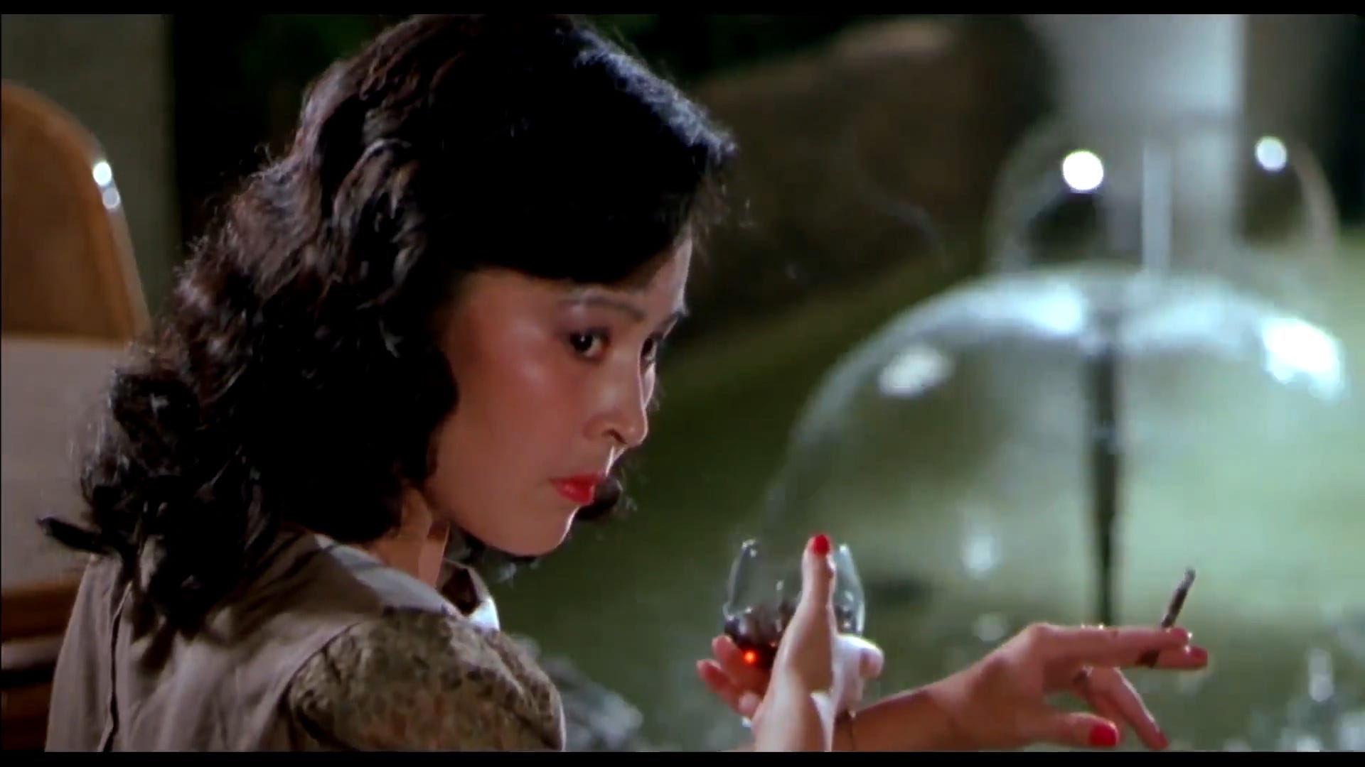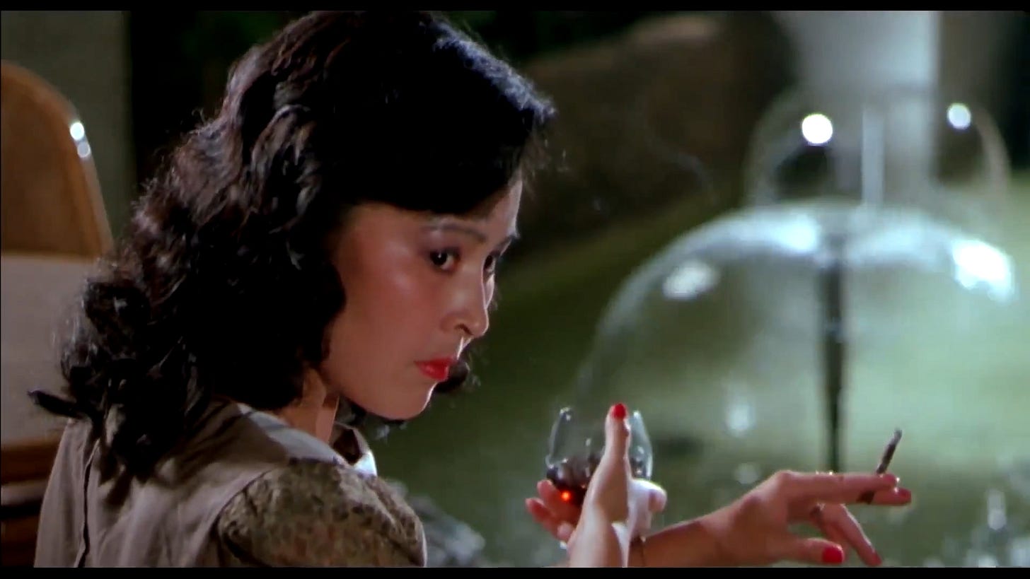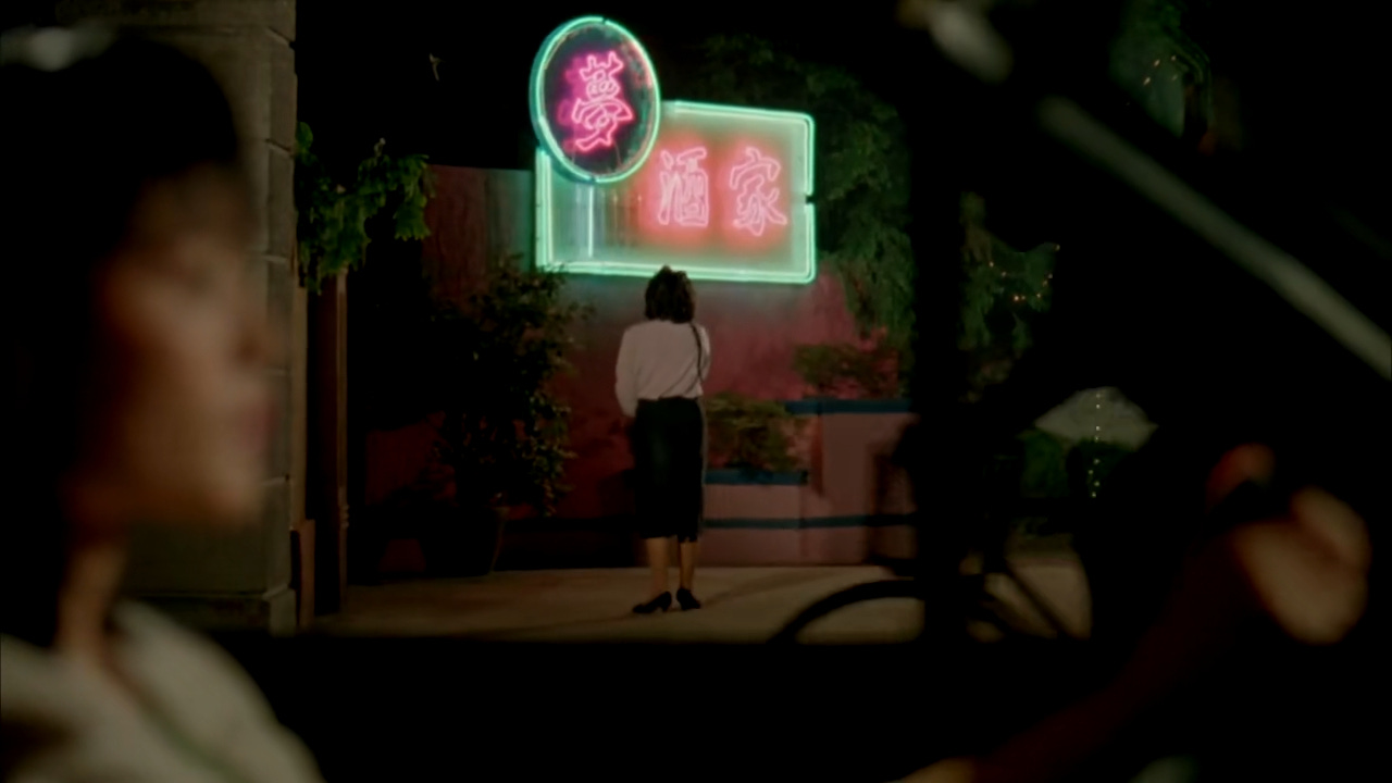 Stylistically it runs counter to everything I thought 1980s Chinese cinema was supposed to be. If you made a film out of my personal proclivities and aesthetic interests you would probably get Porn Freak. It is a classical film noir with very very strong undertones of Desperately Seeking Susan. There are countless shots of neon-lit synth-filled nightclubs, bright red nails, and long drags on cigarettes; the film even has a mostly-faceless noir-esque antiheroine, who holds a white dog and sits behind a sliding bookcase. There is a bordering-on-genius colour scheme, with contrasting pinks and greens almost everywhere. There is also a brilliantly elemental ending, the sort you might recognise from films like Key Largo or Humoresque.